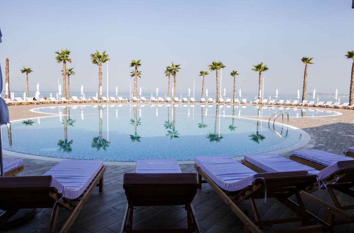 Szép üdülőhely, van egy tisztességes szabadtéri víziparkja. Kedves személyzet, próbálkoznak. Tiszta szállás. A üdülőhely környezete nem tiszta és rendezett. Építőanyagok, szemét stb. A strand finom homokos, fokozatosan mélyül a vízbe, körülbelül 50 méter mélyen a test feléig víz van. Medúzák is vannak. A üdülőhelyen 3 úszómedence és egy pancsoló található. Sós víz.