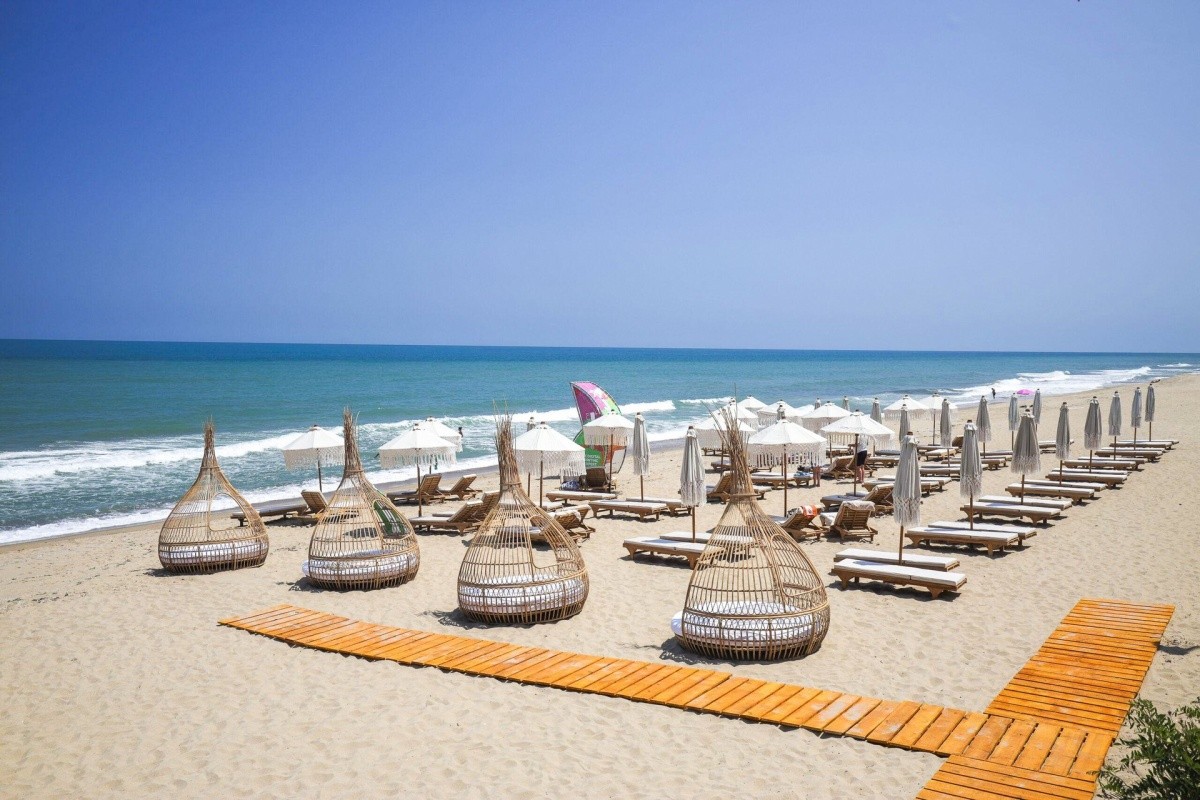 Homokos, fokozatos tengerbe ömléssel a szálloda közelében, ingyenes napozóágyak, napernyők és strandtörölközők.
