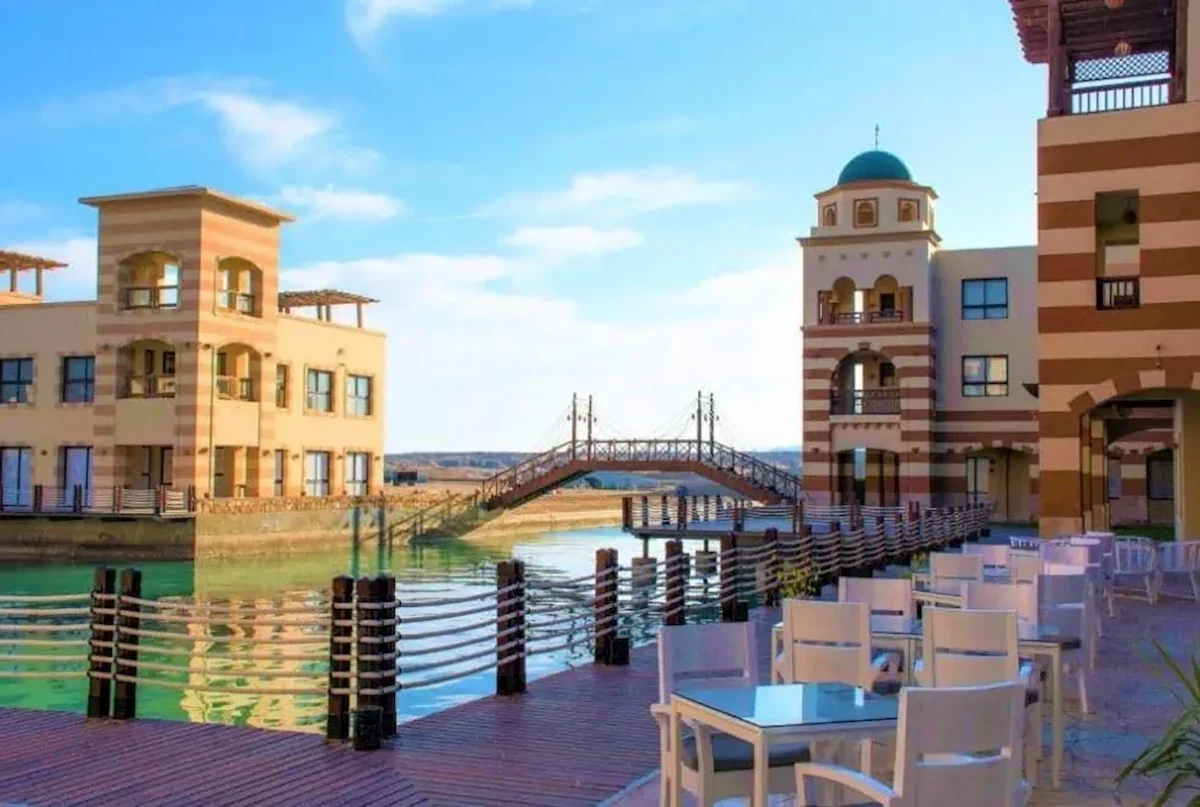 Port Ghalib tengerparti sétányán, kb. 7 km-re a Marsa Alam repülőtértől, kb. 215 km-re Hurghadától,