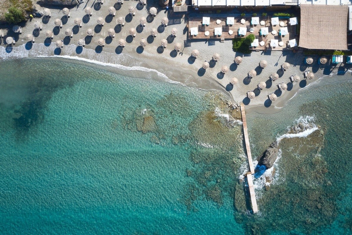 A homokos-kavicsos strand, ahonnan fokozatosan lehet lejutni a tengerbe, az út túloldalán található. A strandra egy aluljárón keresztül lehet bejutni. A strandon ingyenesen bérelhetők napozóágyak és napernyők. A strandon vízi sportok kipróbálására és a vízi játszótérre való belépés díj ellenében vehető igénybe.