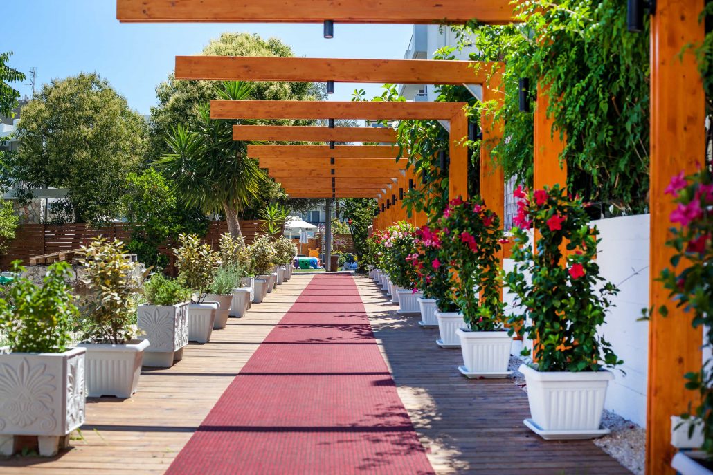 Het hotel heet de gasten in Tigaki welkom.