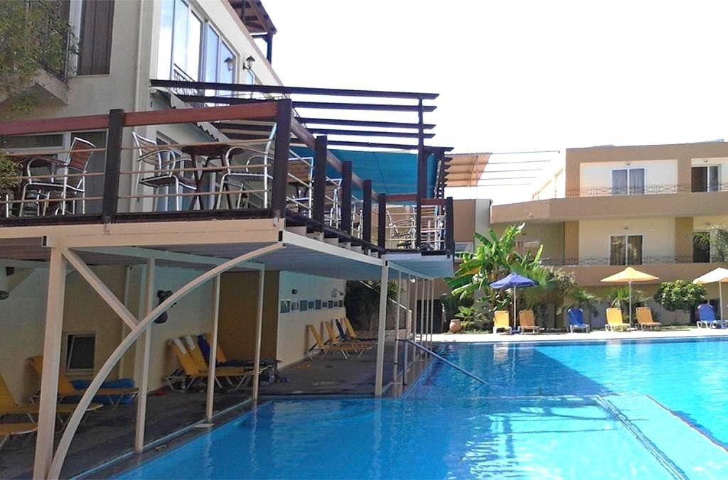 A szálloda a Kavros Beach szobákból áll, melyekhez a tengerparton található medence tartozik – ez a forgalmasabb rész, ahol a recepció és az étterem is található –, valamint a Kavros Garden szobákból, melyek medencéje a forgalmas út mögött, de körülbelül 70 méterre található, így nem hallani a forgalmat. A Kavros Gardent egyik oldalról egy csendes utca és egy csendes étterem veszi körül, a másikról egy másik szálloda, a harmadikról egy mező, ahonnan gyönyörű kilátás nyílik a hegyekre és a naplementére, a negyedikről pedig egy szolgáltató komplexum autókölcsönző irodával. A medence körülbelül 20 méter hosszú és tiszta. A medence nyitvatartási ideje 10:00-18:00. Bejelentkezés 15:00-kor, kijelentkezés 11:00-kor. A közelben számos érdekes látnivaló található – az egyetlen édesvízi tó (teknősökkel) 4 km-re található a szállodától, 4 km-re a másik irányban egy gyönyörű tengerparti kápolna található Georgioupolisban, és 6 km-re a másik irányban egy másik kápolna. A körülbelül 600 méteres bevásárlóközpontban ajándék- és élelmiszerboltok, éttermek, autó- és felszereléskölcsönző, gyógyszertár, valamint kirándulásokat kínáló irodák találhatók például Elafonisi, Balos, Knosos, Cretan Safari és Preveli szigeteire.