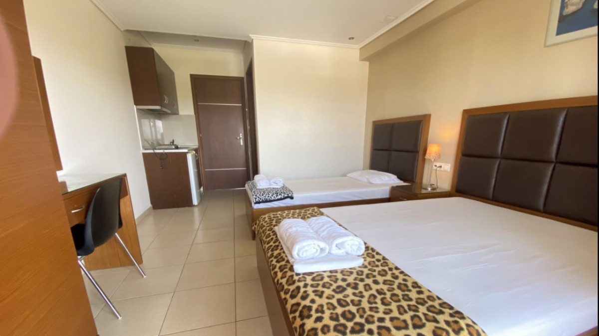 A szobákban a konyhasarok és az ágyak egy légtérben vannak. Minden stúdióban található TV, fürdőszoba és terasz kerti bútorokkal. Légkondícionáló felár ellenében igényelhető, amely a helyszínen fizetendő.Ellátás