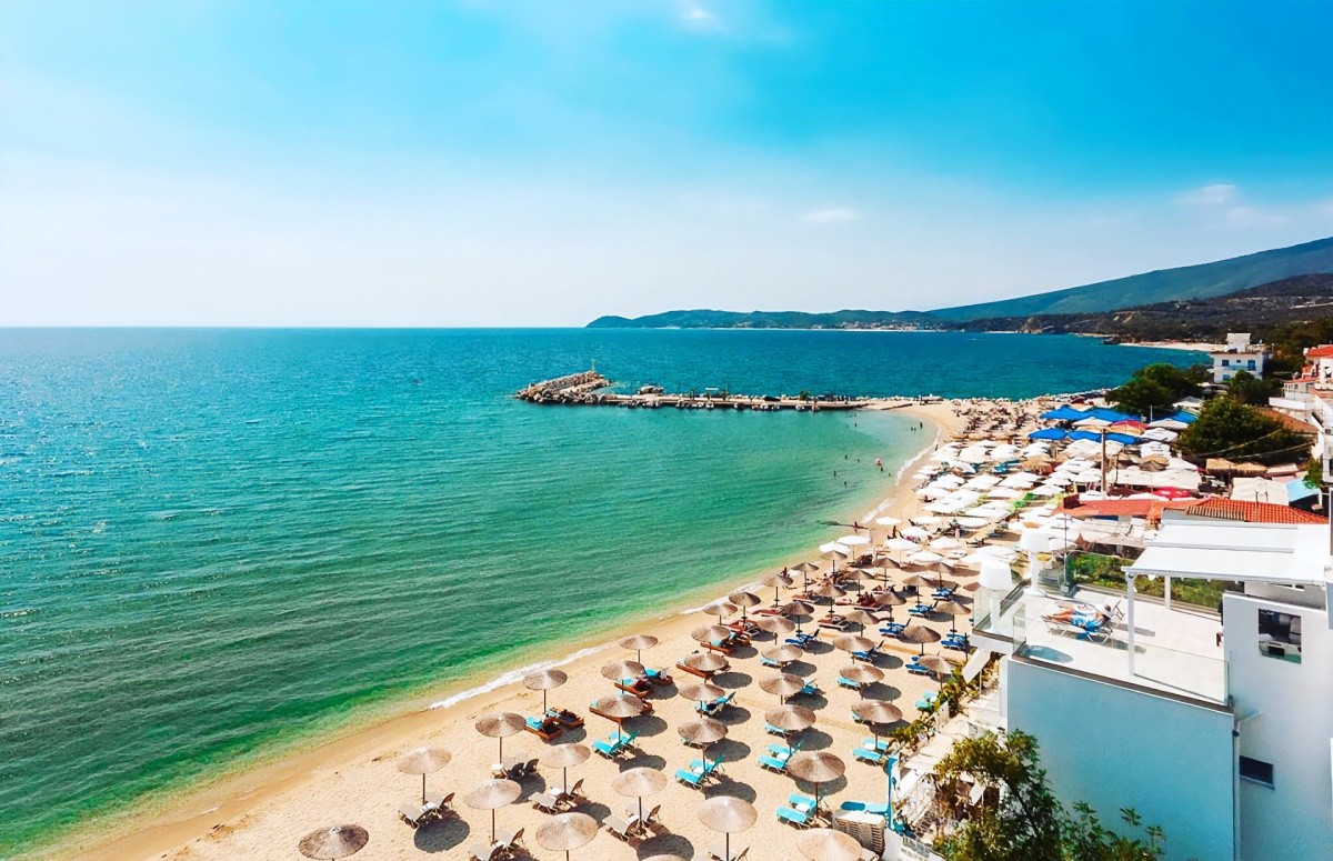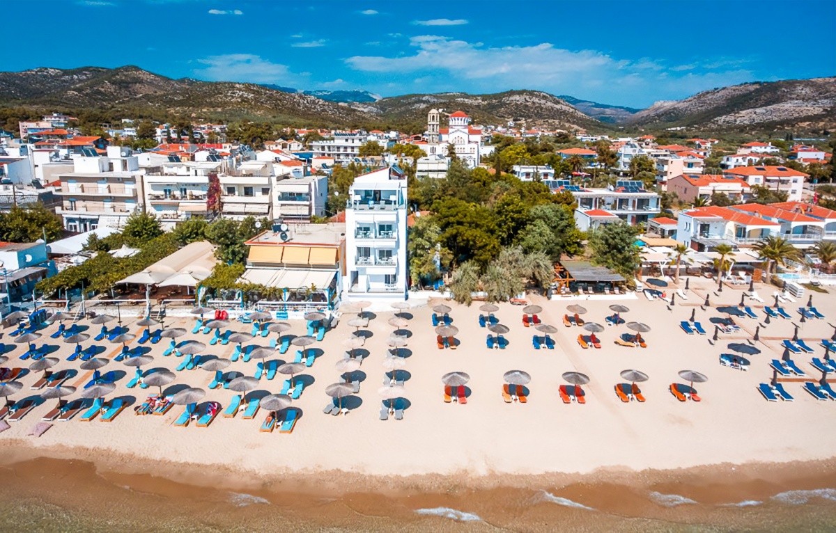 Moderný hotel, priamo pri pláži Potos, neďaleko centra rovnomenného letoviska.