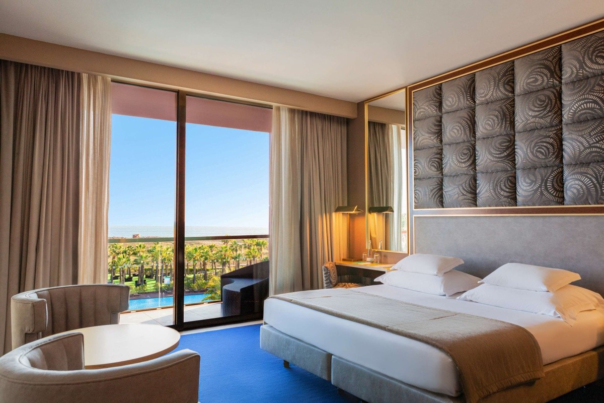 - Prestige Room Golf View (DZX4), Doppelzimmer, Nichtraucherzimmer, Landseite, Golfplatzseite, Golfplatzblick, ca. 42 m², letzte Teilrenovierung 2018, Gesamtanzahl der Räume in diesem Zimmertyp: 1, 2 Einzelbetten (100x200cm), 1 King Size Bett (200x200cm), Klimaanlage: ohne Gebühr, individuell regelbar, kalt, warm, Heizung: individuell regelbar, Fußboden: Fliesenboden, Teppichboden, Safe: ohne Gebühr, Sofa, Schreibtisch, Kaffee-/Teezubereiter, Minibar: gegen Gebühr, Softdrinks: gegen Gebühr, Wasser: gegen Gebühr, alkoholische Getränke: gegen Gebühr, Telefon, Internet: WLAN/WiFi: ohne Gebühr, Fernseher: Flatscreen, im Schlafzimmer, deutsches Programm, Sat-TV, Roomservice: täglich 24 Stunden, gegen Gebühr, Reinigungsservice: täglich 09:00 Uhr - 16:00 Uhr, ohne Gebühr, separate Dusche, Regendusche, separates WC, Bademantel: ohne Gebühr, Slipper: ohne Gebühr, Föhn, Kosmetikspiegel, Balkon: mit Sitzgelegenheit